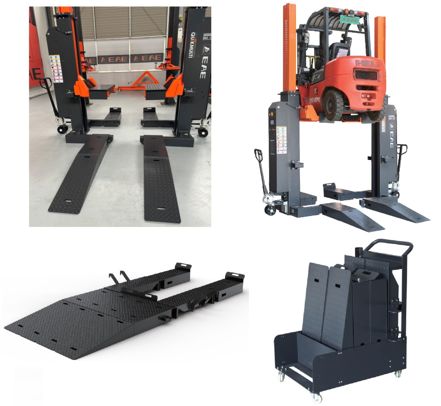 Комплект кронштейнов подхвата с заездными трапами и пандусами для подъема вилочных погрузчиков. Опция для подкатных колонн EE-HDM8х.