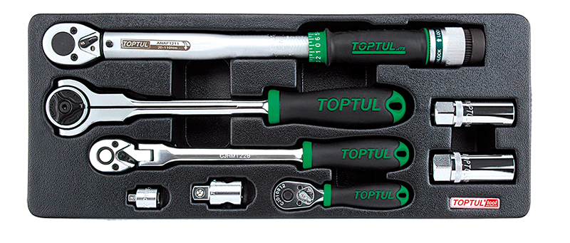 Набор трещоток 1/4", 3/8", 1/2", динамометрический ключ 3/8" 20-110 Нм, переходники и свечные головки, 8 предметов в ложементе (B) TOPTUL купить в Ставрополе и других городах России